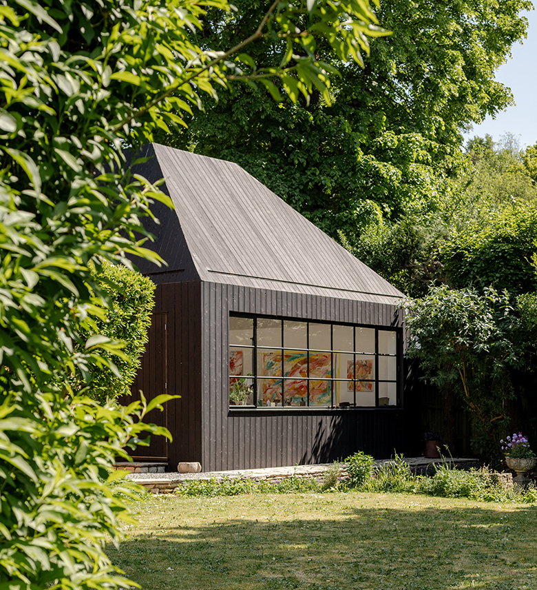 Our approach respects the building’s history while adding a modern steel and glass extension that opens to the river. In the garden, an outbuilding now serves as a bright studio for the client, a sculptor. Sustainability is at the heart of the design, with solar panels providing heat for both the house and studio, and a green roof encourages biodiversity.