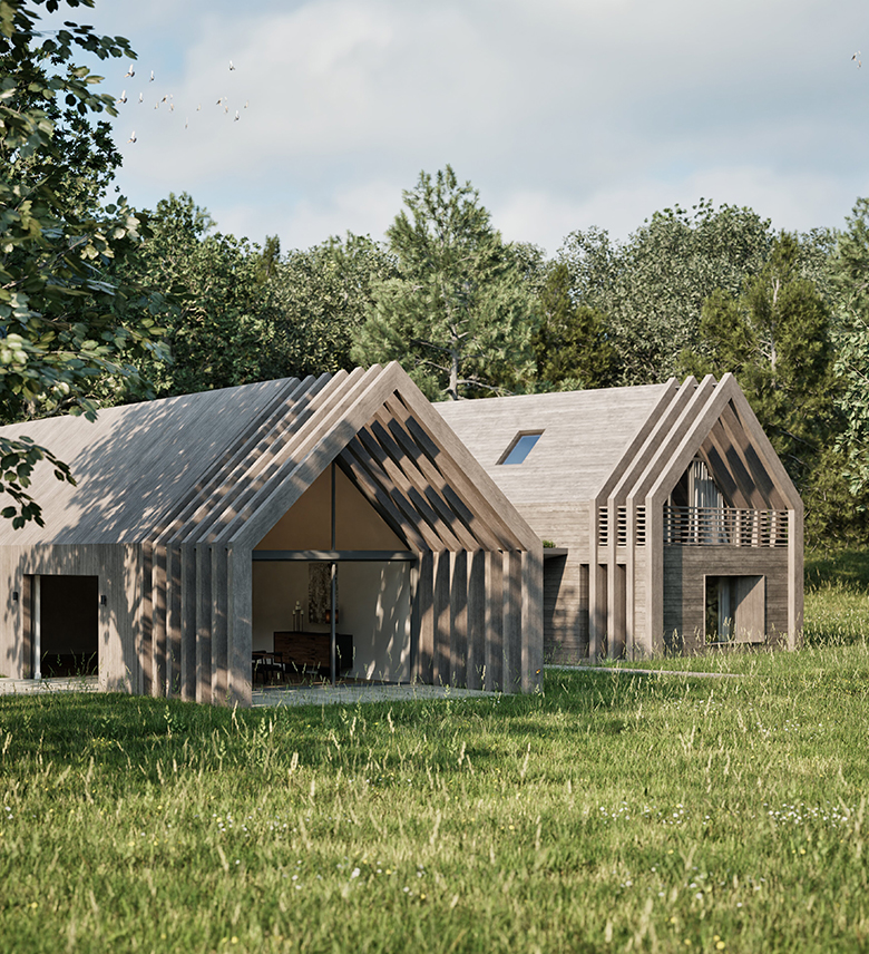 Both wings are defined by striking vaulted pitched roofs, creating generous internal volumes and a sense of openness. The south wing accommodates additional living spaces and opens onto an outdoor terrace that is shaded by an extension of the timber roof trusses. The north wing contains the bedrooms, split across two floors, with the master bedroom benefitting from a balcony offering framed views across the woodland.