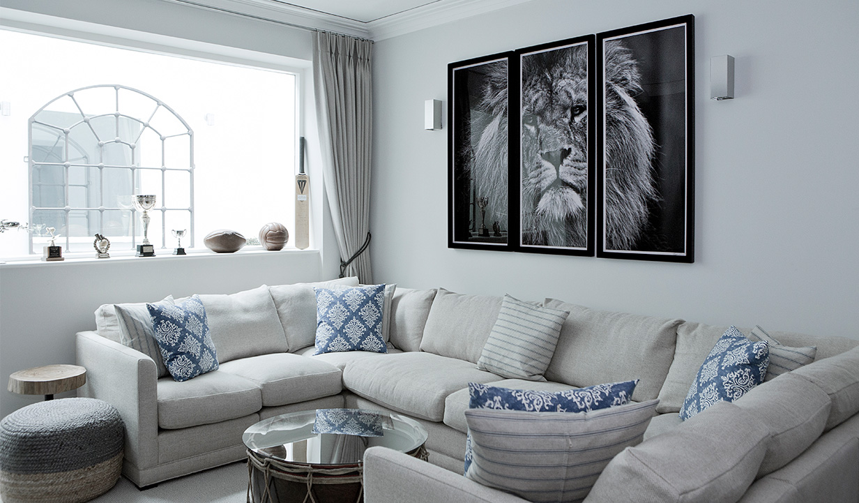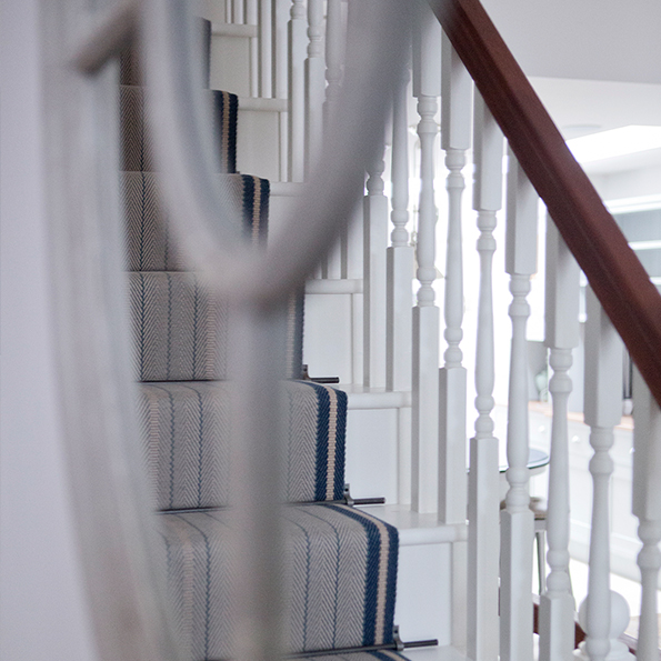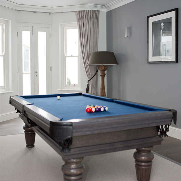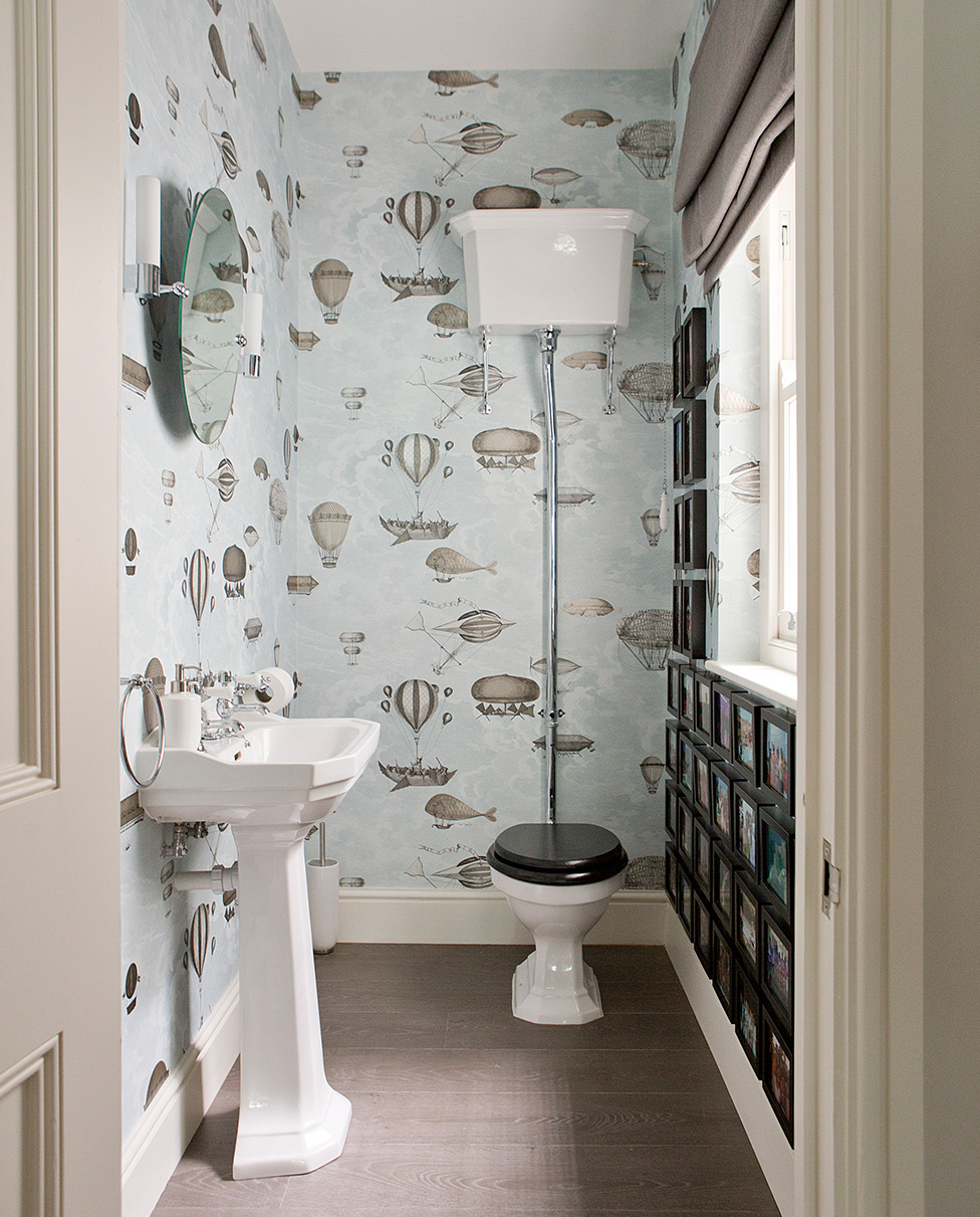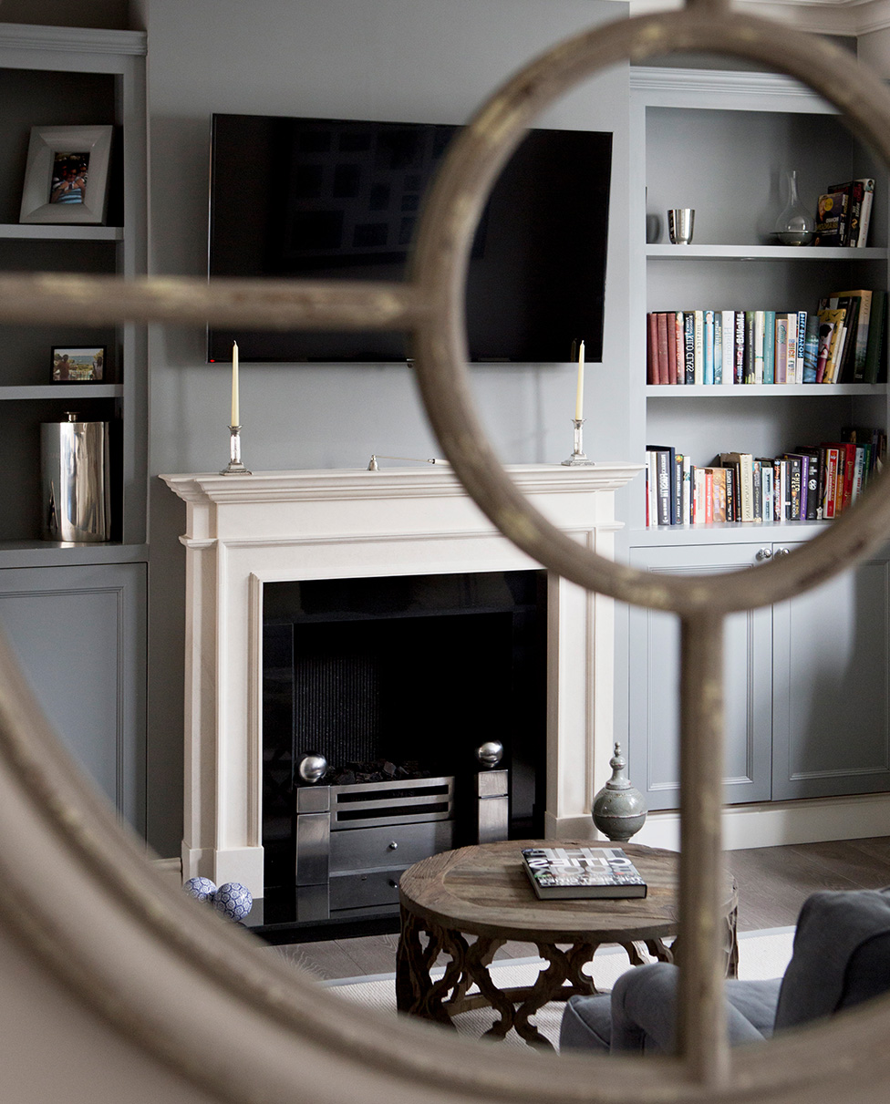 The window of the basement sitting room looks out onto a light well, where a large mirror has been positioned to reflect as much daylight as possible into the room. Mirrors have been used throughout the basement to enable the light from the light wells, rear french windows and roof lights to bounce around the space, creating an open and airy feel.
